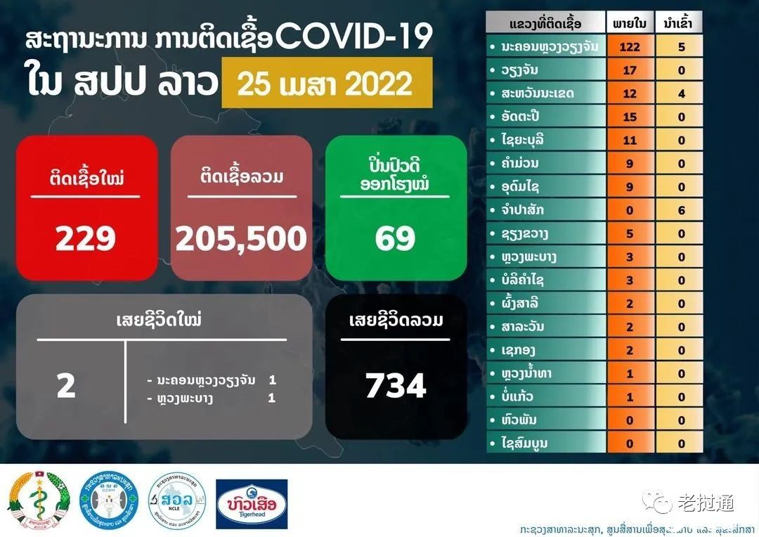 根据老挝卫生部官方账号今早(4月25日)发布的公告,昨日新增确诊229人(含输入15),新增死亡2人,老挝全国累计确诊205500人,累计死亡734人,详情如下: